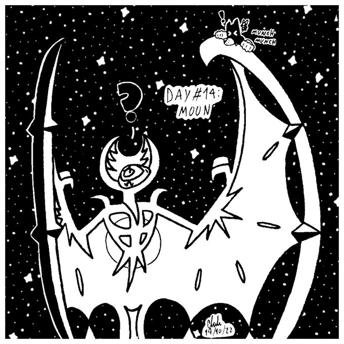 Inktober Day 14 - Moon Lunala, the Moone Pokémon. It sometimes summons unknown powers and life-forms here to this world from holes that lead to other worlds. Chili Bean came out to try the rare cheese the moon is made of! #inktober2022 #inktoberday14 #inktober #pokemon #lunala