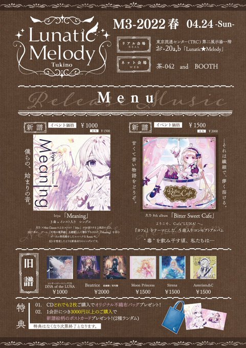 ⋱ #M3 2022春 お品書き ⋰ TRC 第二展示場一階お-20a,b Lunatic★Melody ꪔ̤̫通販 ─tsukino.booth.pm ꪔ̤̫特設サイト Iriya新譜🕊 ─lunaticmelody.wixsite.com/lunamelo/meani… 月乃新譜🫖 ─lunaticmelody.com/sp/bitter_swee… #春M3 でお会いしましょう!✨