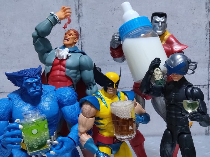 #夜のフィギュア撮影会 6/21『飲む』 ビールにシャンパンにフルーツウォーターにミルクに血液… さて、何を飲む? #オモ写 #MAFEX #ウルヴァリン #マーベルレジェンド #プロフェッサーX #ビースト #マーベルセレクト #コロッサス #ストームコレクティブルズ #デミトリ・マキシモフ