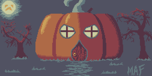 As we tried to find a way out of the forest, we saw a strange looking house... Didn't look very inviting... but it did not matter. It was cold and we were exhausted. So, we entered the #pumkinhouse... #Pixelart #ドット絵 #aseprite @pixel_dailies #pixel_dailies #MAF_Pixels
