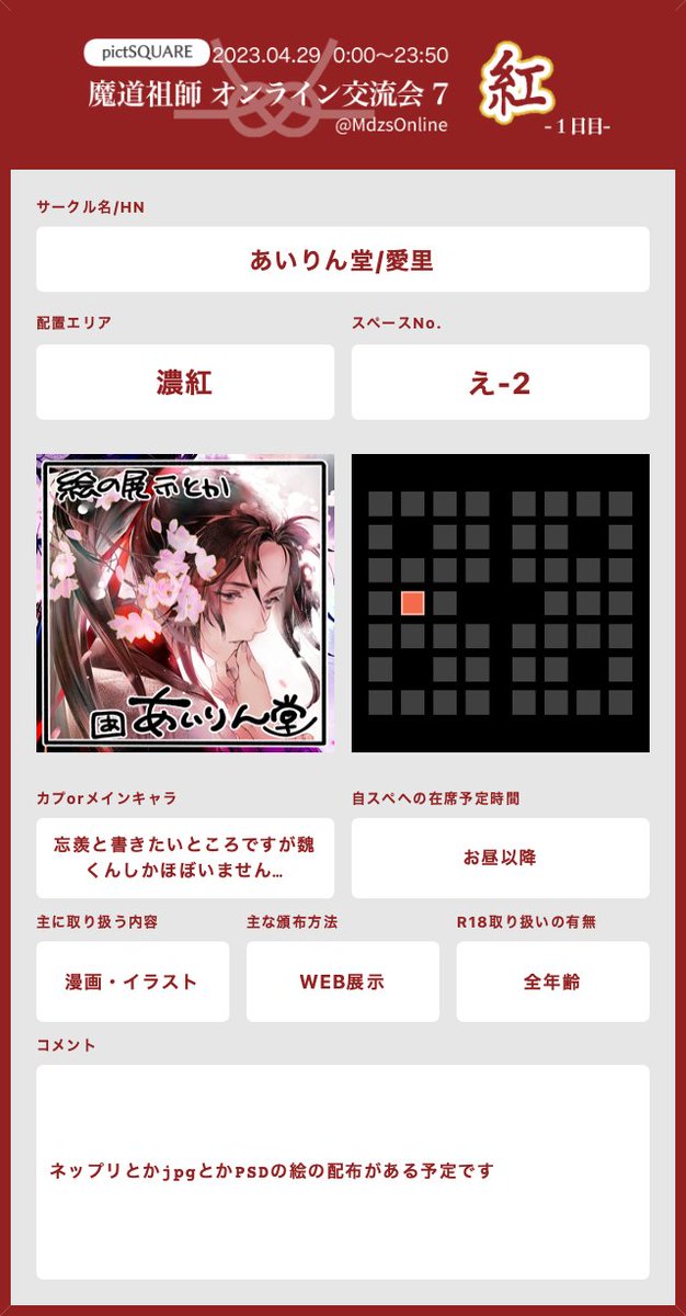 ギリギリギリでお品書きができました やましろや 29日蘇芳: う3 30日胡粉: う3 ポイピクの漫画は交流会以降も読めます お部屋頑張ったので良かったら見に来てやって ください✨ ラジドラカフェのアクスタ部屋です エフェクトも無料配布しています #MDZS交流会7_紅 #MDZS交流会7_白