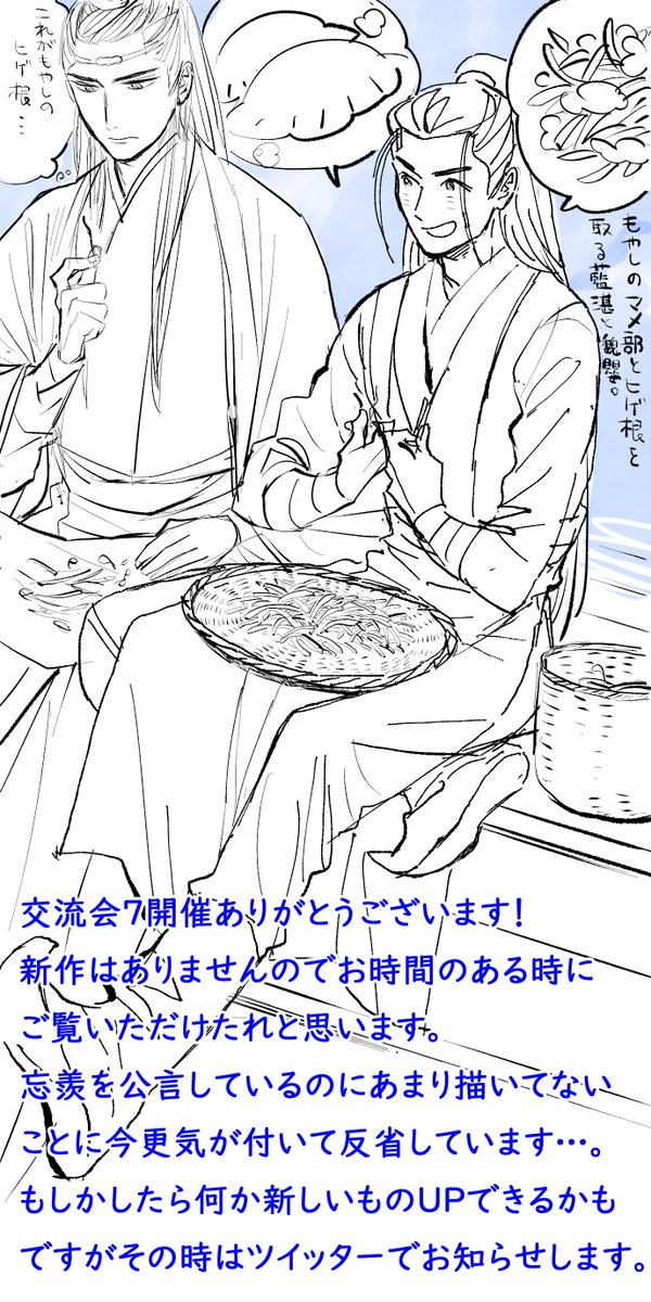 4/29交流会7紅のみの参加です。疲れてなかったら何かか描けるかな…?↓よく分からないと思いますがもやしの豆のとことヒゲを取り除く藍湛と魏嬰を描きたくなったので描きました。料理は何だろう…餃子的な包みものと卵炒めかな…?あ、これがお品書きです。よろしくお願いします🙏。#MDZS交流会7_紅