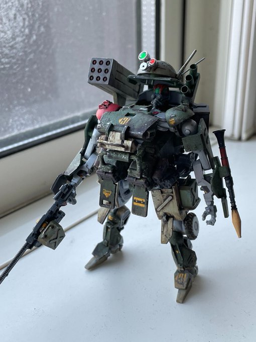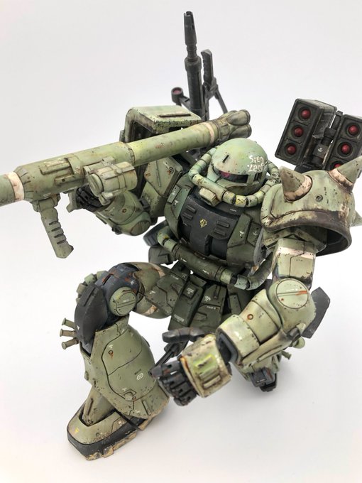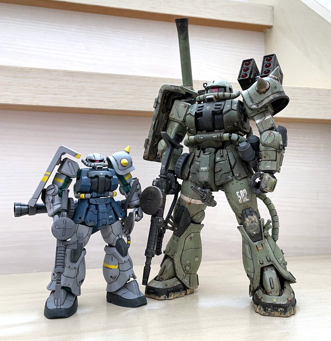 #見た人もなにか無言でミサイル付の何かをあげる あれ?ミサイル持ち、この二機だけ? 偶然にも緑の量産型、肩越しミサイル😝 #RSC装甲騎兵型エグゾフレーム #MGザク #ガンプラ好きと繋がりたい #ガンプラの画像を貼るとRTされると聞いて #オブソリート #MODEROID