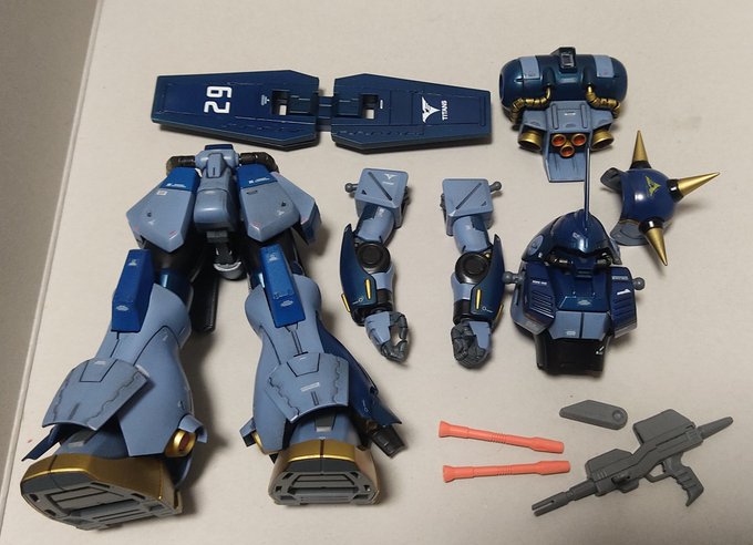 やったあ!完成!って思ったら また武器類を塗り忘れていたわたし😂 赤だとシャアのイメージだから ティターンズは連邦だと聞いて 連邦寄りに 細かいパーツ落としたら絶対無くすだろうから 神経擦り減りまくり もう少しだあ🫰 #MGマラサイ #ガンプラ女子 #ガンプラ好きと繋がりたい twitter.com/eri58999876/st…