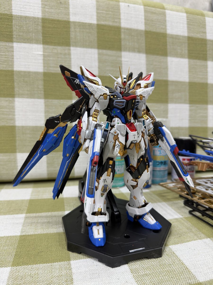 年末年始に楽しく作ったMGEXストフリ一応完成! いつものように缶スプレーと簡単フィニッシュ。軸折れ気にせずポージング出来るくらいに程よくグリスアップしながら組みました。羽根の基部は硬いしバラけやすいし、折れやすい。指の次にヤバイなあそこは。 #MGEXストライクフリーダム #ガンプラ