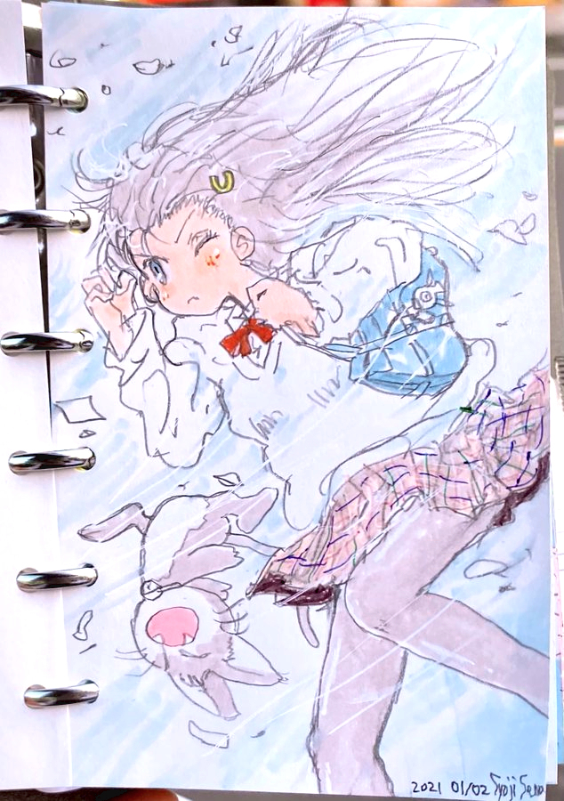 #2021年自分が選ぶ今年の4枚 手のひら大システム手帳版! (仕事の隙間時間にお気軽楽描きんぐ♪) チョイスが難しいなー(」゚□゚)」 ・「今日は風が強いなぁ」 ・「ドキッ!どきどき」 ・『スク水マフラー天使』 ・『オシロとALL☆STAR』 #MINI6HOLES #Original #Archive