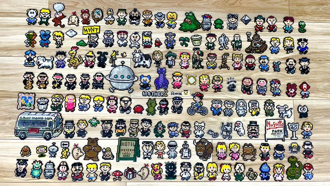 MOTHER2、28周年おめでとうございます🎉 今年は「CAST」ポスターと同じ163体のビーズ キャラでお祝いだー🥂✨ポーズやドットが違ったり、1体存在しないポーズがあるので、もし良ければ探してみてください🌏 #MOTHER2_28th #MOTHER2_28周年 #MOTHER2 #earthbound #アイロンビーズ #ミニフューズビーズ