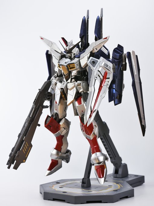 武者シナンジュ完成しました SDEXシナンジュをベースに創傑伝やヒーローズのパーツを流用しつつ肩はスクラッチしました 黒立ち上げでスターブライトシルバーを吹いた上からクリアレッド→アメジストパープル→クリアレッド→光沢コートで仕上げてみました #MPC祭 #やすしのディフォルメ道