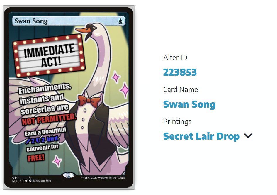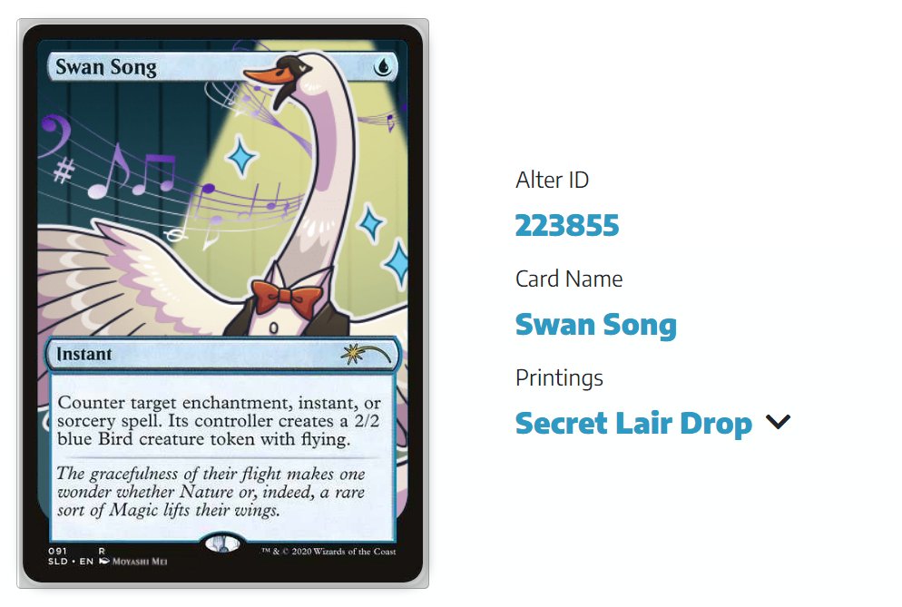 Do you hear that? It's SWAN SONG premiering right now in a special double feature! Which one is your favorite? Use the links bellow to get yours 🦢💙 Full Art Swan Song: altersleeves.com/product/fhmqny… w/ Oracle Text: altersleeves.com/product/0jffnu… #MTG #MTGA #Art #fanart @AlterSleeves