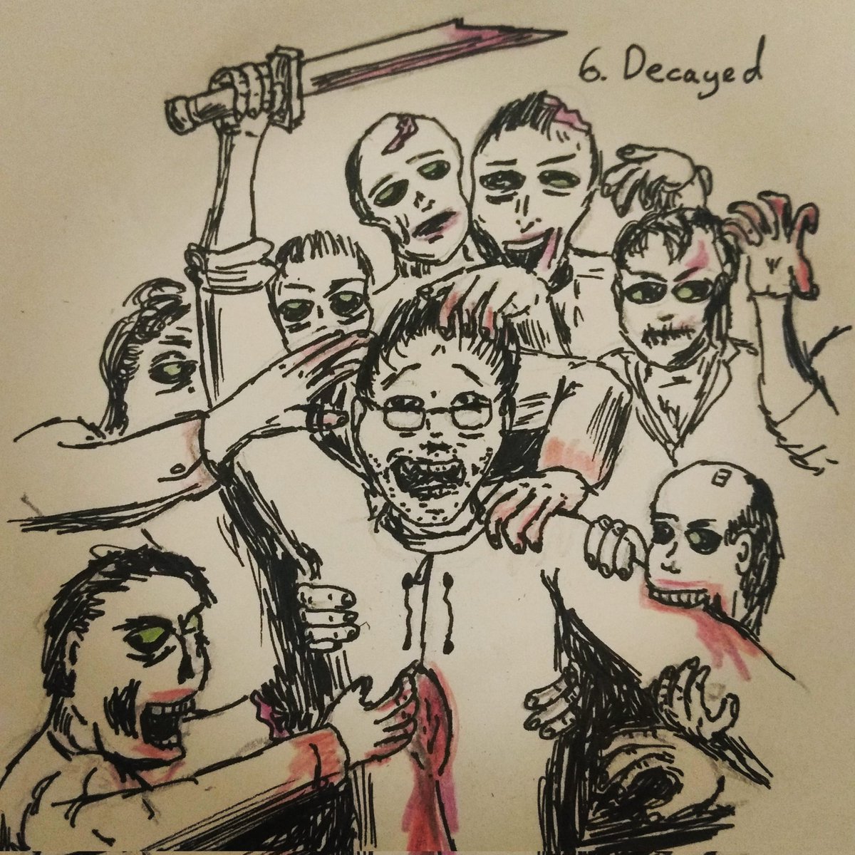 #Magictober 6: Decayed. The Fool was certain the recruiter said his new job would involve guarding the city walls for a decade. As he was pulled into the grasping, gnashing mass of former citizens, he wondered if he'd misheard. #inktober #MTGMidnight #MTGInnistrad #DrawAndCreate
