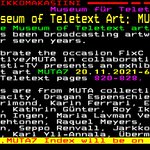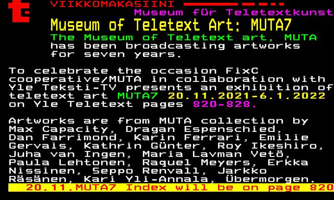 Coming tomorrow! 7 years of the Museum of Teletext Art @ Yle Text. yle.fi/aihe/tekstitv?… 🖼 📺 7️⃣ #teletext #muta #pixelart #museumofteletextart @maxcapacity