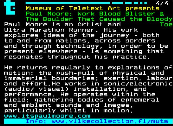#MuseumofTeletextArt #MUTA Paul Moore: Work Blood Blister & The Boulder That Caused the Bloody Toe #tekstitv #teletext #arkistopikselit #pixelart yle.fi/aihe/tekstitv?…