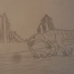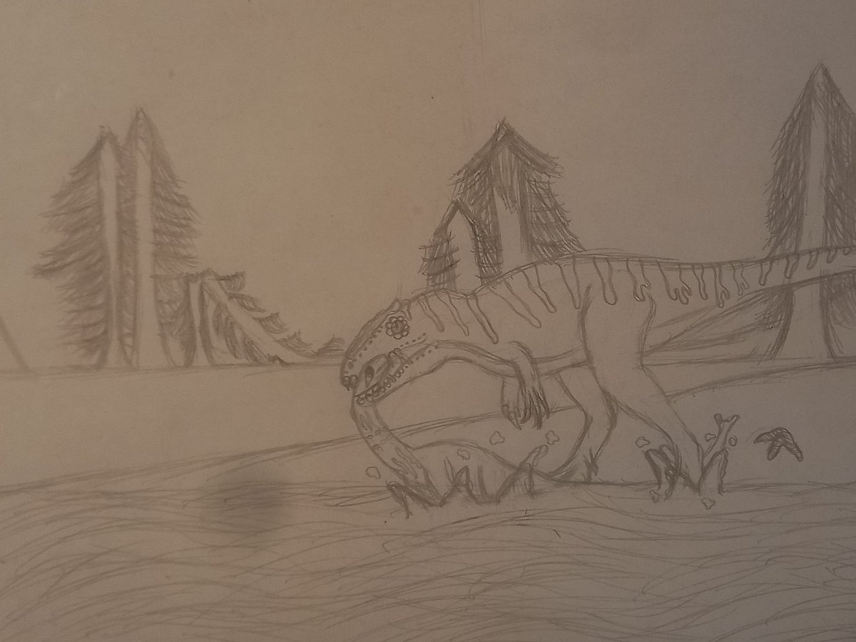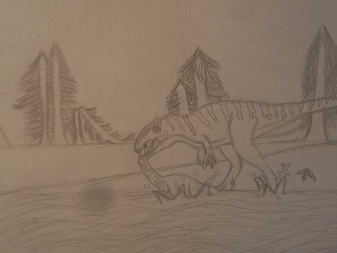 A Sketch I did this morning . A Young Female Sinraptor takes down a juvenile Mamenchisaurus near the bank of a fresh water lake . #Sinraptor #Mamenchisaurus #paleoart #dinosaurs #art