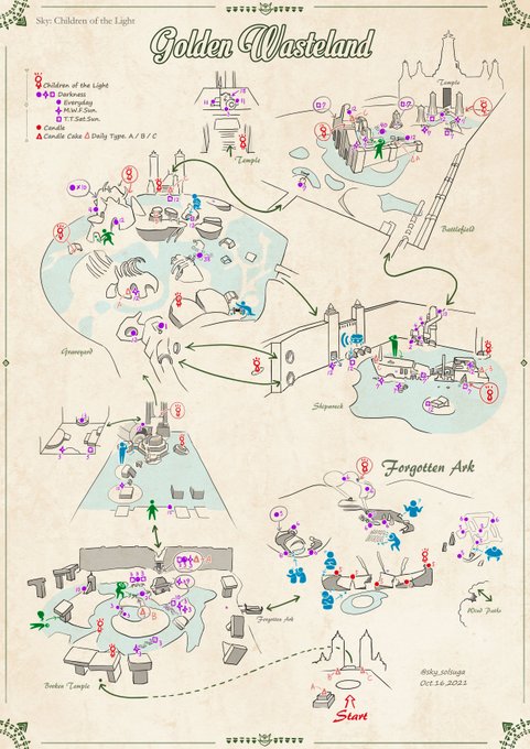 sky各エリアのマップNo.5 「捨てられた地」 各エリアを一枚に纏め、精霊・光の子・光・闇花の位置と光の数を地図に記入 あなたの旅のお供にお役に立てば幸いです Sky Children of the Light Golden Wasteland Map #thatskygame #sky星を紡ぐ子どもたち #捨てられた地 #地図 #Golden_Wasteland #map