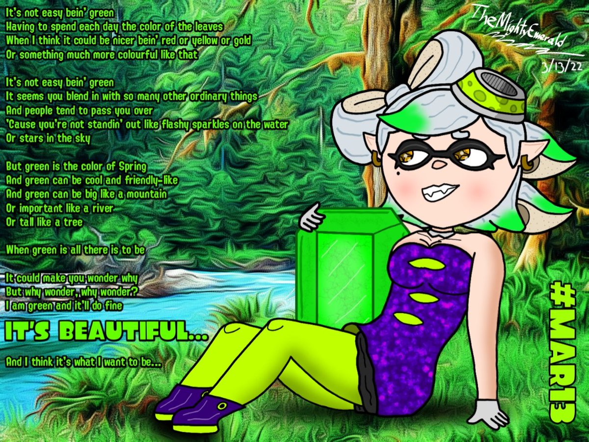 HAPPY MARIE DAY EVERYONE!!! Marie and I are taking time together to reflect on our color... 💚💫 #MAR13 #MarieDay #splatoonart #fanart #squidsisters #marie #Splatoon #Splatoon2 #Splatoon3
