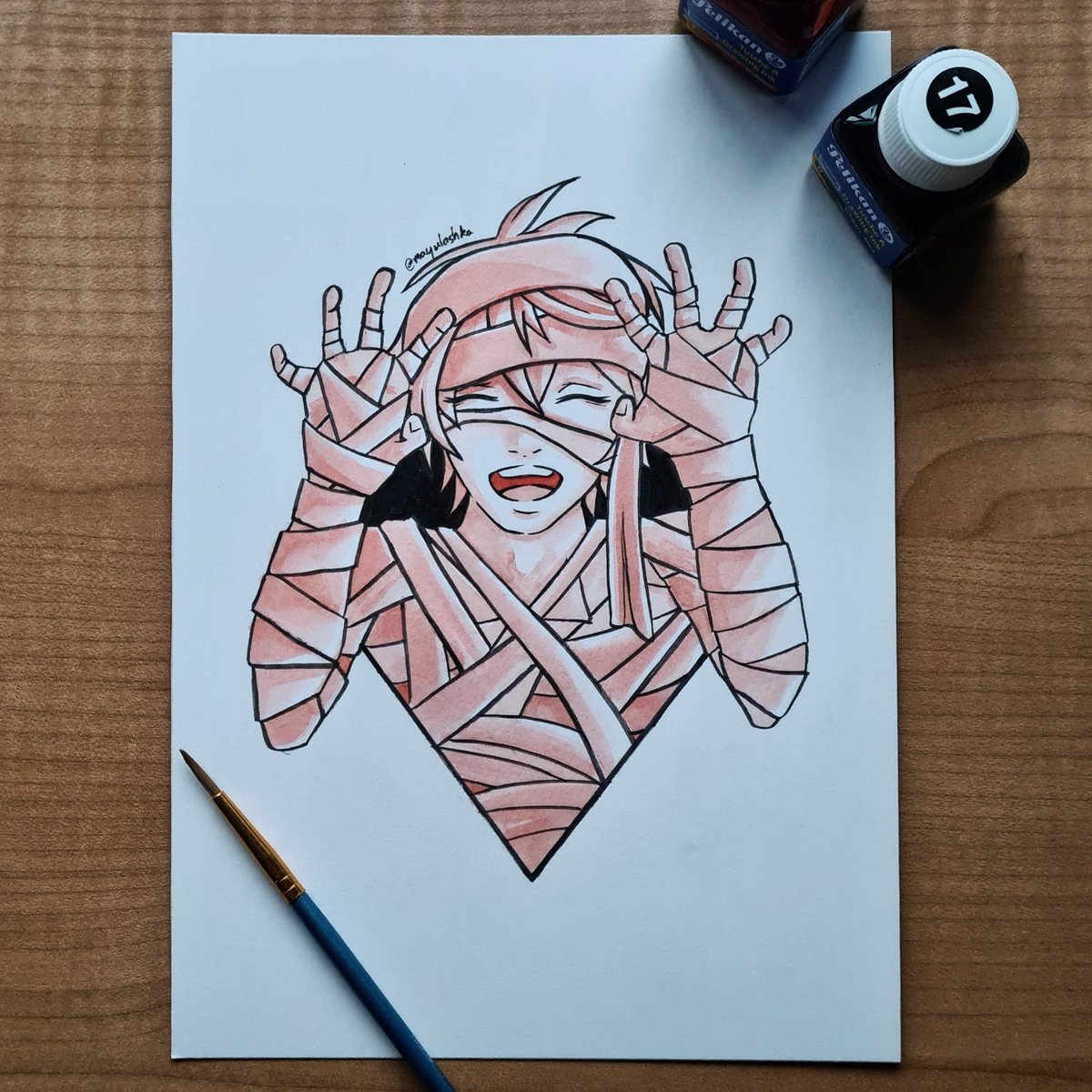 🔶️《05. Bennett》🔶️ He has heard stories about some ancient Sumeru rituals. The mummies fascinates him and, since he has a lot of bandages at home, he decided to become one 🤕 #Mayulashka #GenshinImpact #原神 #Bennett #Drawtober2021 #Tintubre #Tintubre2021 #Inktober