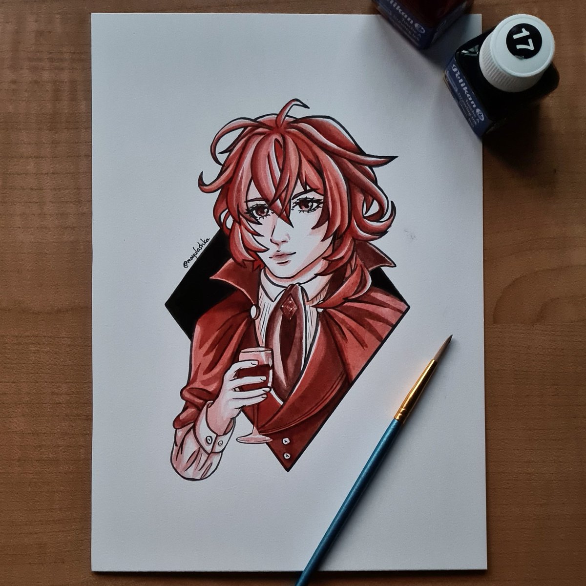 🔶️《09. Diluc》🔶️ He thought this whole Halloween thing was a bit silly, but he ended being a grape juice vampire, with themed tavern included 🍷🧛🏻♂️ #Mayulashka #GenshinImpact #原神 #Diluc #Drawtober #Drawtober2021 #Tintubre #Tintubre2021 #Inktober