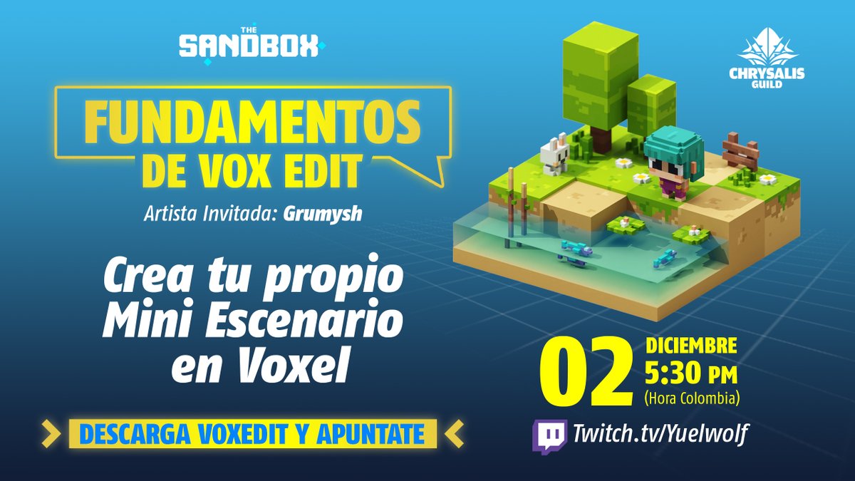 Quedaste con ganas de hacer tu propio #Voxelart después de ver el #Metaverso de @TheSandboxES❓ Entonces no te pierdas el taller de #voxEdit que @Grumysh ha preparado para ti el día de hoy donde aprenderás los fundamentos de este software! Solo por 👉twitch.tv/yuelwolf