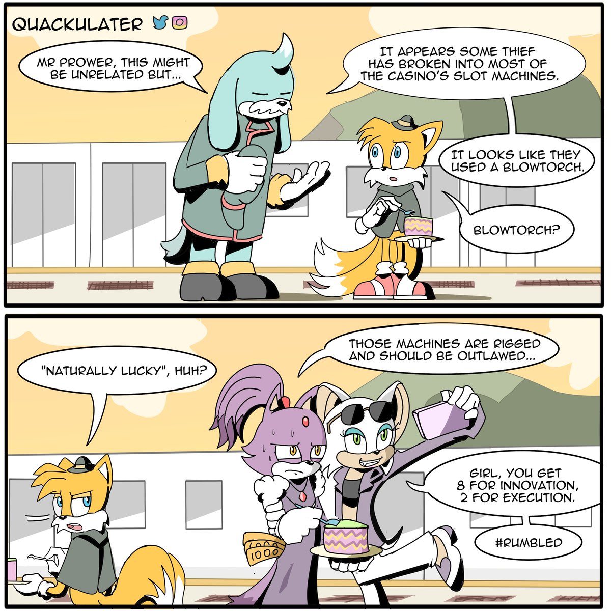 Blaze has a gambling problem and does a crime. Don’t worry, Rouge won’t tell the Sol Dimension about their beloved princess (for a price.) #SonicTheHedgehog #DigitalArt #TheMurderOfSonicTheHedgehog #MilesPrower #BlazeTheCat #RougeTheBat