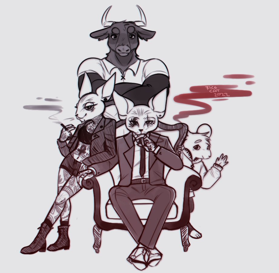||Commission|| Draknock's #noble #blood #wizard #tabaxi, Mr. Mittens and his yakuza crew of #retainers! #mousefolk #minotaur #sphynxcat #dnd #dnd5e #dndart #furryart