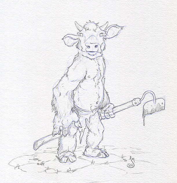 How about a little #DungeonsAndDragons doodling for today's #DailyDoodle? ...A young #Minotaur is ready for adventure beyond the maze with his trusty Battle Hoe. What is his name? #DandD #dndart #WIP