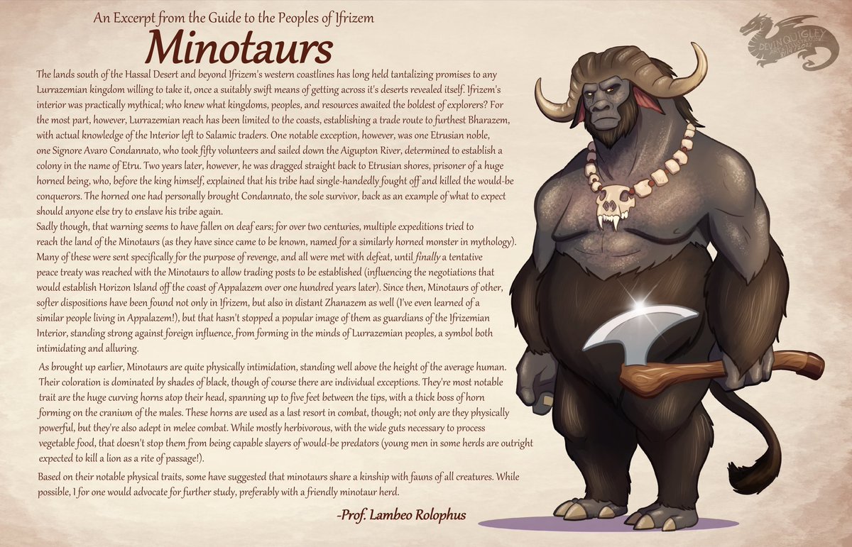 Hard-headed and easily persuaded, Noona is a pirate infamous for his ruthlessness in combat. #dndcharacter #minotaur #fantasycharacter #DnD
