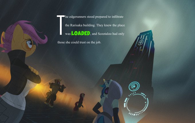 Scootaloo and her rag-tag team of edgerunners prepare to infiltrate a large building. Commission for @PWhateverer, and one of the last SFW comms I'll be doing for awhile. #MLP #mlpfim #mlpg5 #mlpg4 #mlpfanart #cyberpunk #Cyberpunk2077.