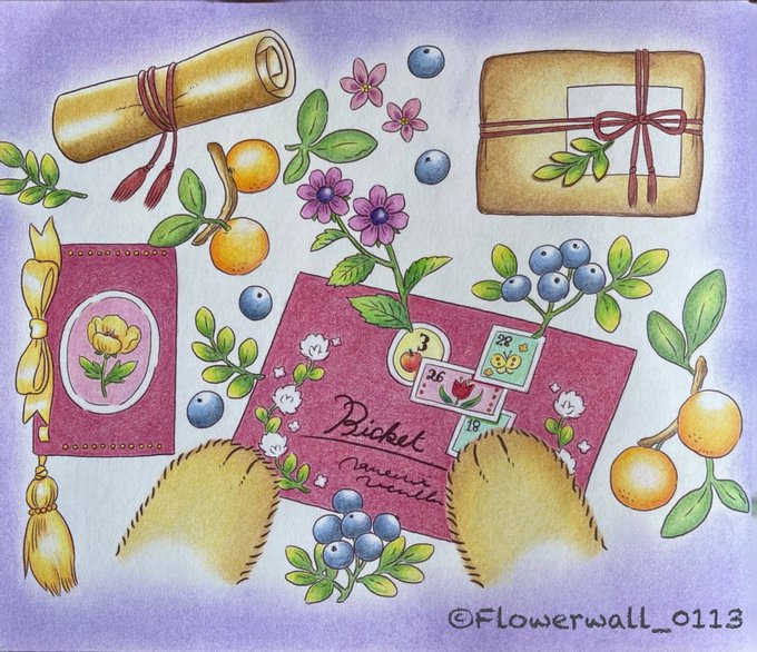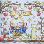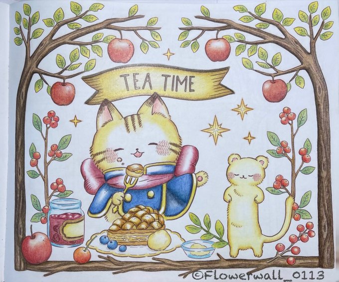『特製パイでティータイム☕️』完成しました🖍✨ ネコのビケットとオコジョのブランカが可愛い💕 アップルパイを美味しそうに塗るのが難しかったです🍎 #大人の塗り絵 #moco #ネコの雑貨店と魔法のカギ