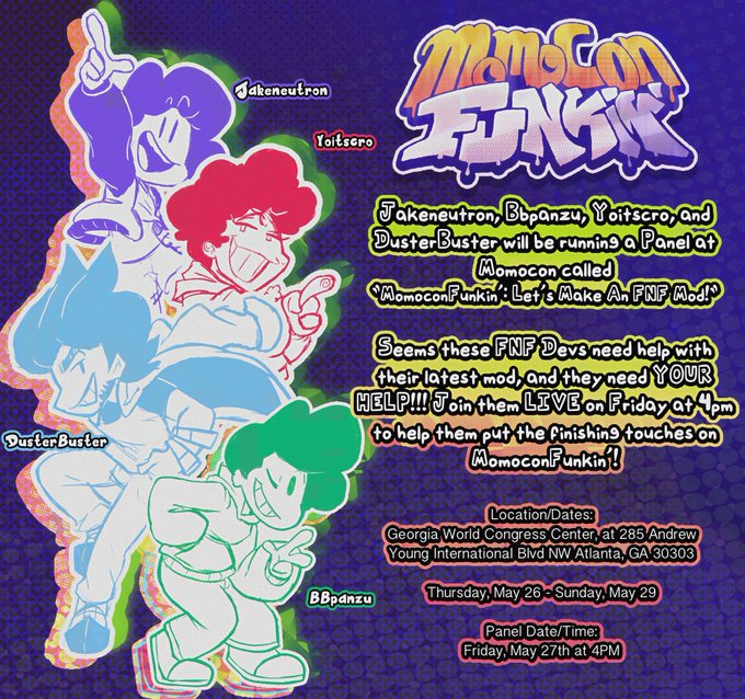 Guess who’s beeping and bopping to Momocon!?? @bbsub3 @SirDusterBuster @yoitscro and I are gonna be hosting a Panel at @MomoCon this year! We’re working on an FNF mod LIVE! But are gonna need some help finishing… maybe the audience can help 👀 #fridaynightfunkin #momocon2022