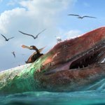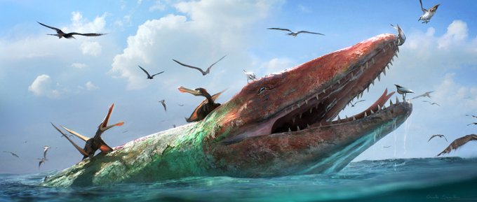 Paleo-ilustración del “Titan de los mares" Un gran Thalassotitan .atrox atrapa desprevenido a un pequeño mossasaurido frente a las costas de Marruecos hace 66 m.a .Siendo el depredador ápice de estos mares , similar a las orcas modernas . #Thalassotitan #mosasaur #paleoart