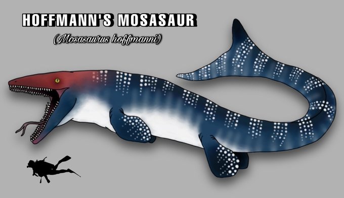 {The Hoffmann's Mosasaur} (Re-upload) 📌 Mosasaurus hoffmanni 📌 Meaning : Hoffmann's lizard of the Meuse River 📌 Length : 15-16 meters 📌 Mass : 14 metric tons 📌 Temporal Range : Late Cretaceous 82 - 65 Mya 📌 Ecology : Apex Predator #paleoart #paleoprofile #mosasaurus