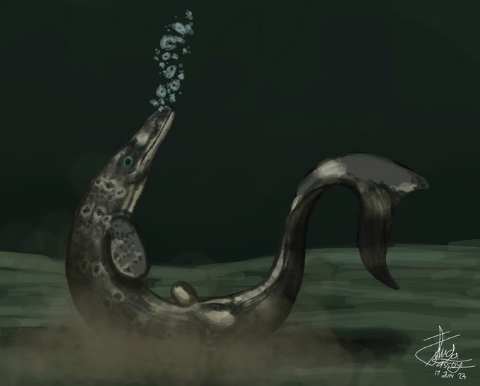 A few days ago, I had a literal wave of memories nostalgia going back to when I was little. Growing up on both JP and Freddi Fish led to some really out-there wishes when I was a kid. The Mosasaur's name is "Lonesome Lenny" #paleoart #mosasaurus #artistsontwitter
