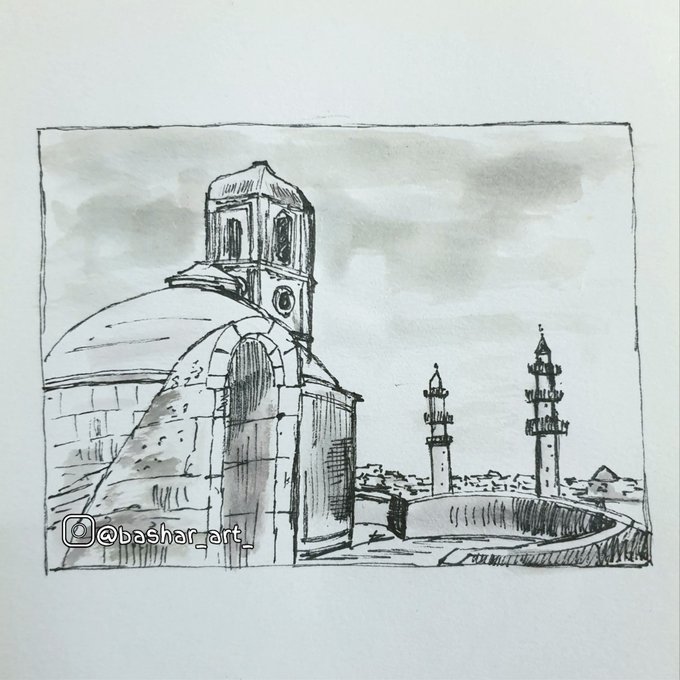 The Church of the Hour in the city of Mosul, opposite the two minarets of Al-Saffar Mosque .. By ink pen #mosul #Iraq #fabercastell #ArtistOnTwitter #art #drawings #drawingwhileblack #INK #inktober2021 #painting #church #Mosque @FaberCastell_BR @faber_castell @UNESCOIraq