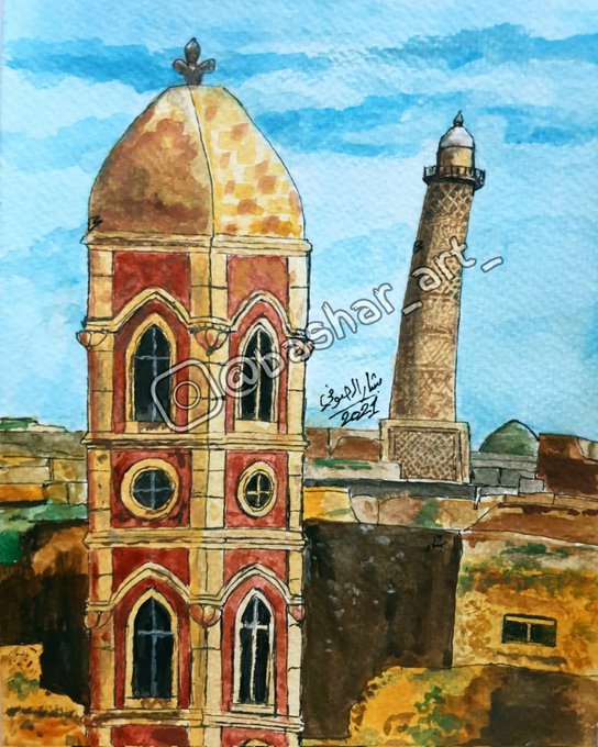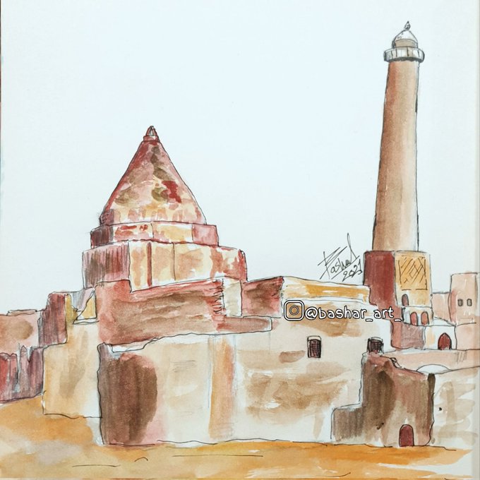 A view of the tower of the Maskinta Church and the minaret of the Great Mosque of Al-Nuri _ Al-Hadba minaret.. in the city of Mosul _ Iraq 🇮🇶 #mosul #Iraq #ArtistOnTwitter #art #drawings #drawingwhileblack #INK #inktober2021 #painting @UNESCOIraq @UNESCOarabic #watercolorart
