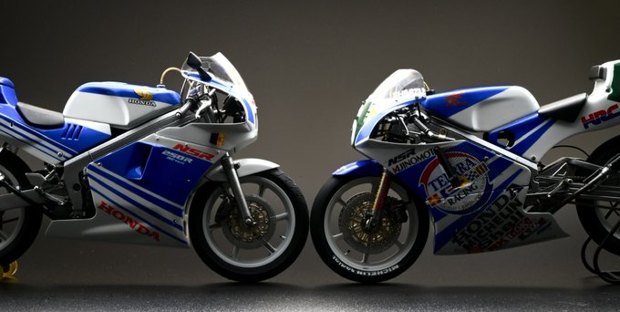 2台のNSR250。 ・タミヤ 1/12 AJINOMOTO Honda NSR250 ‘90 ・アオシマ 1/12 ホンダ NSR250R ‘88 何とか完成しました。 テラブルーという共通項を与え、2台を統一感を持って作ってみました。同時に作ることは苦労もあったけど、概ね楽しかったです。 #MotoRacerコンペ #MotoRacerコンペ完成