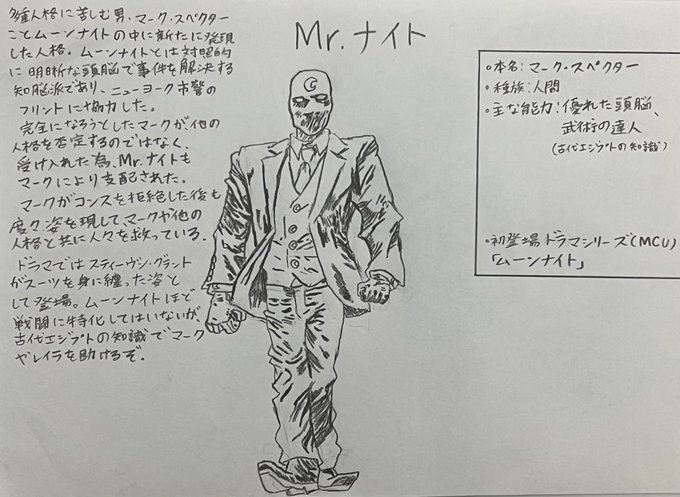 手描きMCUヒーロー列伝Mr.ナイト ・本名:マーク・スペクター ・種族:人間 ・能力:優れた頭脳、武術の達人 ・初登場ドラマ作品(MCU) 『ムーンナイト』 #marvel #illust #ムーンナイト #Mrナイト #芸術同盟 #絵描きさんと繋がりたい #みんなで楽しむTwitter展覧会