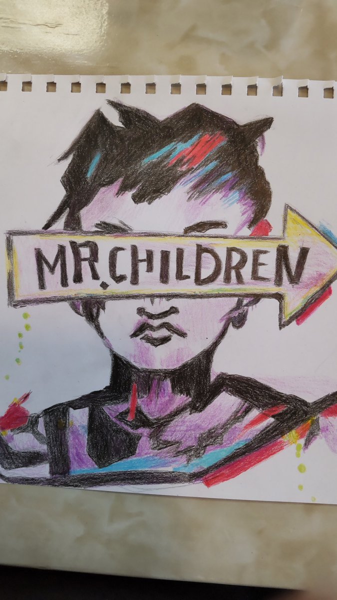 #ミスチル絵画部 #MrChildren #色鉛筆画 初ツイートです💦 親子で絵を描くのが好きで、台風で引きこもりandお盆休みという事もあり…ミスチルロスを埋めるべく!! エントランスマンを色鉛筆で描きました😂 ツイートの仕方を我が子にレクチャーしてもらえて嬉し🥰✨