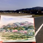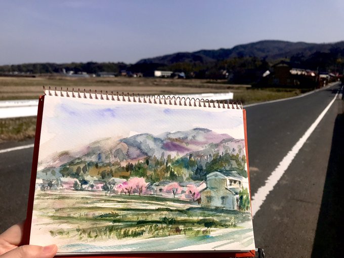 早朝、京丹後市峰山界隈にてスケッチしました。桜はまだ咲いていませんが、木だけあったので、絵の中では咲かせてみました😅🌸 #ランプライト水彩紙 #muse #サムホール #水彩画 #京丹後市 #峰山 #スケッチ #watercolor #aquarelle #countryside #landscape #sketch