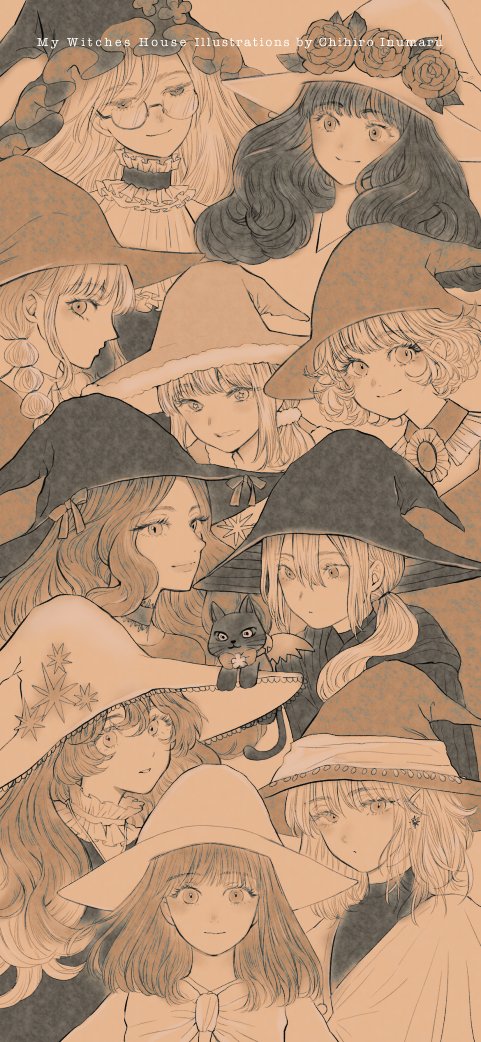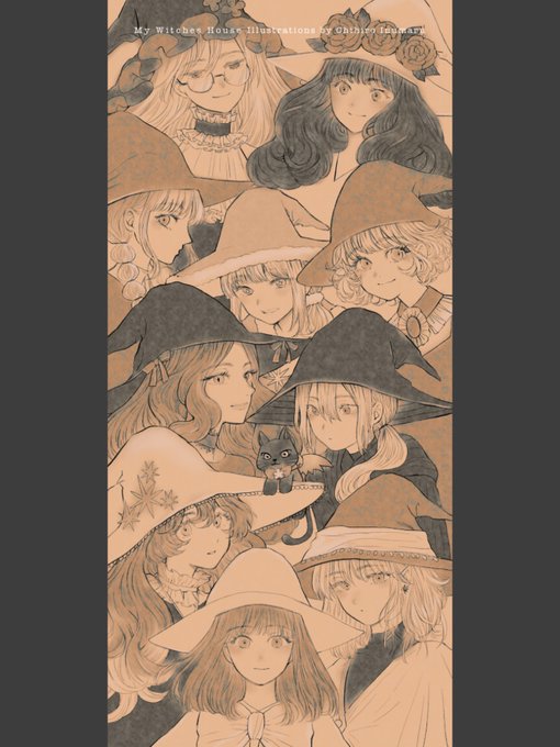 #MyWitchesHouse 魔女10人記念イラスト✨ セピアカラーなフリー壁紙です。待受画面のサイズに合う方を保存して使ってください。設定報告お待ちしております♪待受スクショツイート歓迎!それ以外の使用は不可です。 ちなみに魔女はあと15人増えます。 Produced by @atoko_eth Illustrations by 私
