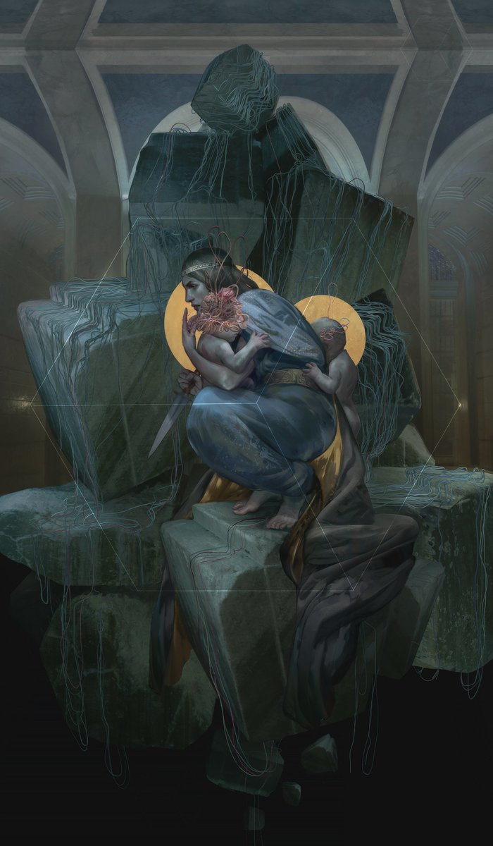 Medea in flux between motherly love and revenge, on the verge of killing her sons. Google her, the way she is depicted is ultra unsettling. Had to paint it. #artistsontwitter #MythologyMonday