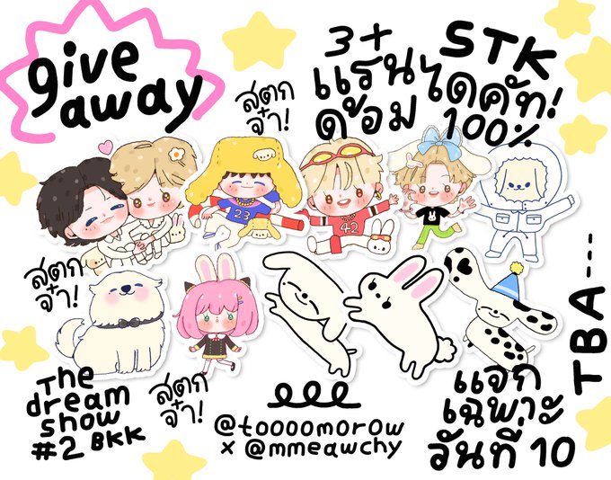 ★ giveaway ★ @tOOOOmOrOw x @mmeawchy สตกจ๋าจ๋าไดคัท สุ่มให้สามชิ้น+ มีจำนวน 80 สุ่มน้า++ ꔛ แจกเฉพาะวันที่ 10เมษา ꔛ เวลาและสถานที่ : tba ★ pls rt + show this tweet ★ #NCTDREAM_THEDREAMSHOW2_in_BKK #น้องดรีมรวั้กนะแก 🫶🏼💘