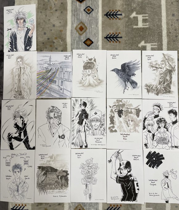 インクトーバー完走記念に床に並べてみました😆 どれがよかったとかお聞かせくださるととても嬉しいです☺️ #inktober2021 #インクトーバー2021 #インクトーバー #破壊神マグちゃん #高校生家族 #NERU武芸道行 #クーロンズボールパレード