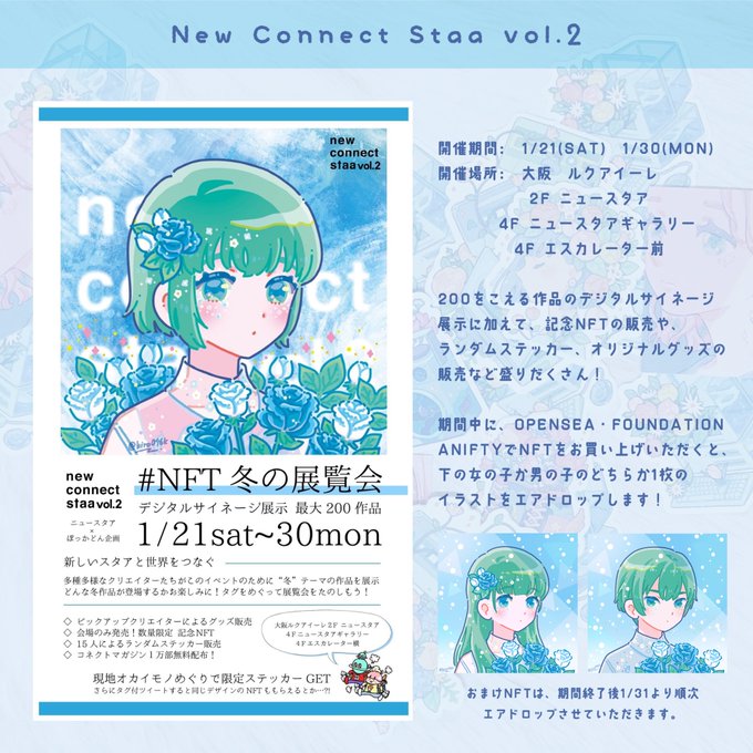 デジタルサイネージにて↓の作品を展示していただけることになりました😆ウレシー! 1/21〜30大阪ルクアイーレ✨ お出かけのついでに是非見に行ってみてください❣️ #NFT冬の展覧会 twitter.com/new_cnt_staa/s…