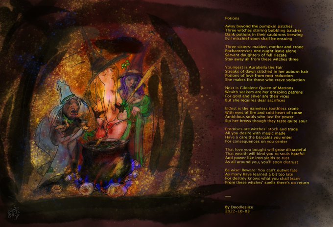 Potions (Three Witches) by doodleslice Now available for buy now price of : Ξ .02 knownorigin.io/gallery/216470… @KnownOrigin_io Art by @doodleslice #NFTMintMonday #NFTdrop @niftorian #poem #illustration #digitalpainting #art #nft #nftcollectors #nftcommunity #eth