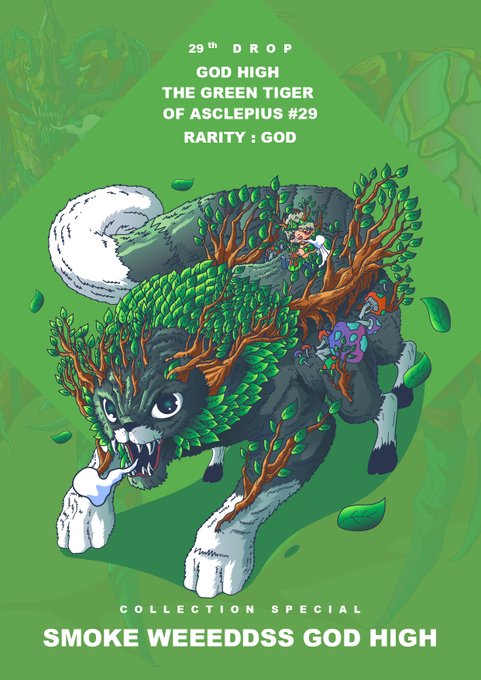 COLLECTION SMOKE WEEEDDSS GOD HIGH ONLY 30 PIECE DROP 29/30 SOLD 22/29 GOD HIGH THE GREEN TIGER OF ASCLEPIUS #29 RARITY : GOD 0.055 $ETH NOW AVAILABLE OPENSEA opensea.io/collection/smo… #Ethereum #nftcollector #NFTCommunity #NFTdrops #OpenSeaNFT #NFTartist #NFTs