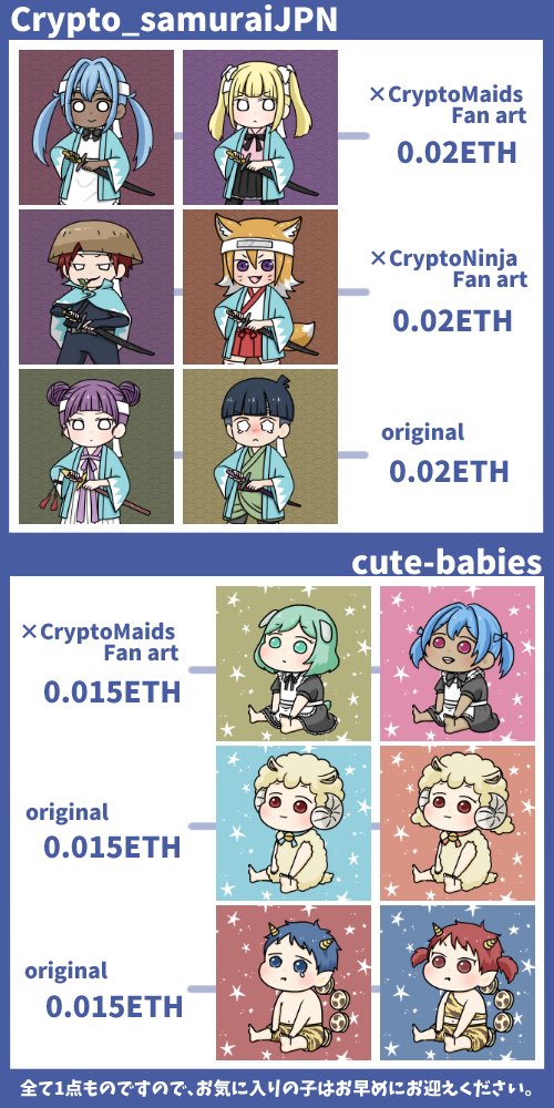 10月31日に開催される「NFT fes1」にサークル参加します! スペースナンバー「う3」です。 Crypto_samuraiJPN、cute-babies各6点ずつ出品します。 #NFTfesお品書き はこちら。 pictsquare.net/092bf2p64t3lna… #NFTfes1 #NFT #NFTjapan #CryptoMaidsFanArt #ninjart #cryptoninja二次創作 #NFTfes