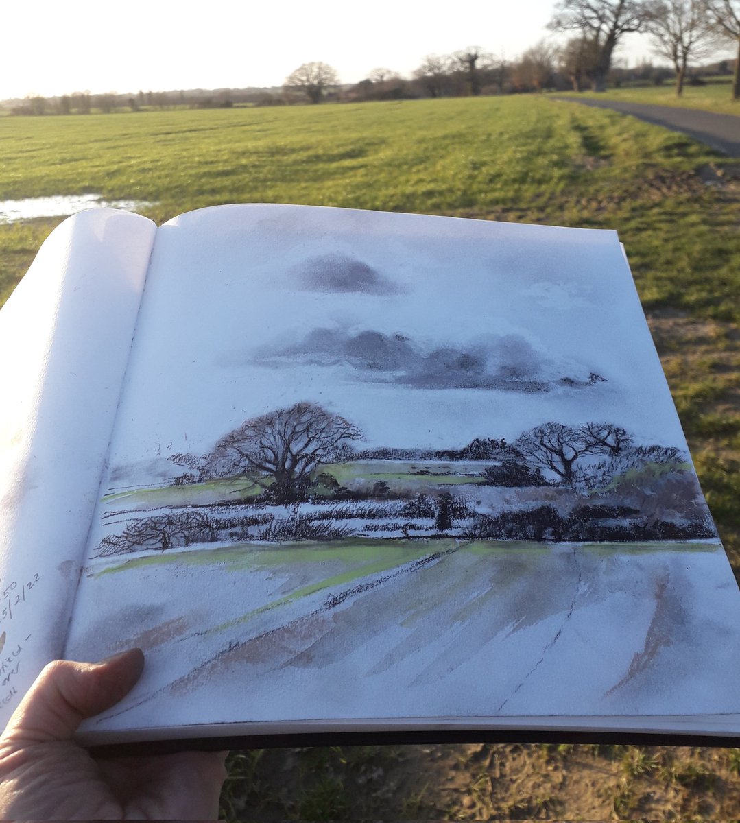 Day 7 #DrawingAugust whilst enjoying a nice bike ride this morning, I was taken by this view of Haveringland St Peter and the big Norfolk sky. #Norfolk #bikeride #sketchbook #ArtistOnTwitter