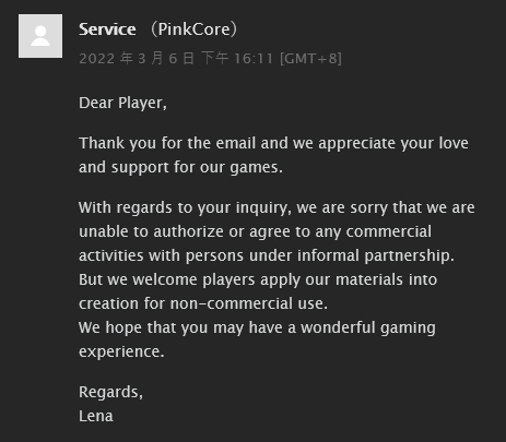 เราได้เมลไปถามทาง PinkCore ผู้ให้บริการเกม #NUCarnival ถึงเรื่องของการนำตัวละครไปใช้ในในงานขายต่างๆมา ทีมงานตอบมาน่ารักมากๆแต่ไม่อนุญาติให้ใช้เชิงพาณิชย์ใดๆนะคะ แต่สามารถใช้แบบ non-commercial ได้ค่ะ #NUCarnivalth