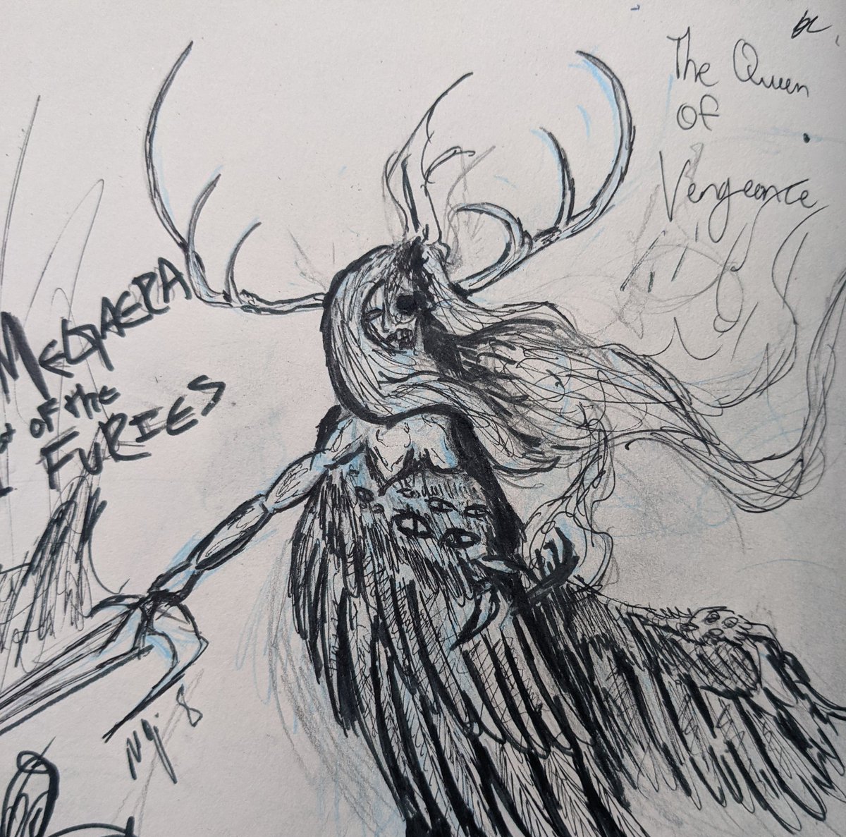 Yea yes I know. #Inktober is over and I should be working on #NaNoWriMo. But hey, fun fact about my #ttrpg setting. The furies are a type of angel that serves Azrael, god vengeance, fire, and well fury... This is his wife, Megaera
