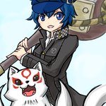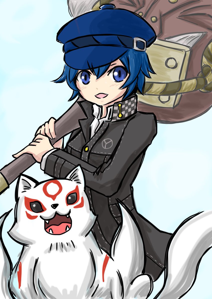 いつもモンハンで遊んでもらってる友達にイラスト描きました〜。 お友達が大好きなP4のキャラ(にモンハンのハンマーを装備)+アマテラスの重ね着したお供ガルク #NaotoShirogane